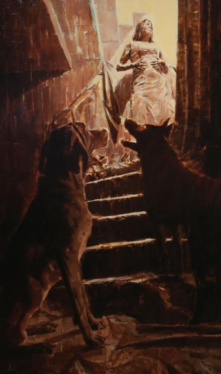 “Andare oltre la superficie per addentrarsi ad un livello di comprensione più profondo, cogliere una verità più ampia, che si cela tra pennellate dinamiche e sovrapposte è necessario dinanzi le opere di Alex Preti, che ha fatto dell’allegoria uno degli elementi chiave della sua narrazione in pittura. Ricorrendo a immagini suggestive, attraverso il proprio paradigma – che non ricerca il realismo, ma che si dirige innanzi una natura simbolica, a tratti onirica – l’artista indaga e rappresenta l’antica tradizione dei tarocchi alla ricerca dello svelamento della loro semiotica e con essa la comprensione della vita umana.L’arcano XIII, sinonimo di trasformazione, mutamento, fine di un ciclo che porta con sé un nuovo inizio, è la scelta su cui ricade il suo racconto visivo.Su di una tavolozza dalle tonalità volutamente limitate, che colora una composizione che attinge al classico, Preti da vita ad un definito chiaroscuro – non solo elemento tecnico, ma espressivo – che accresce l’intensità delle scene, creando un’atmosfera di suspense e drammaticità.Bagliori di luce, provenienti quasi sempre da fonti esterne, si stagliano sulle sue figure illuminando i contorni, svelando ambienti tanto “nebulosi” che paiono suggerire un’origine inconscia. Proprio gli spazi – spesso interni – che non presentano eccessive decorazioni, semplici e desolati, intenzionalmente abbozzati, permettono di focalizzarsi sulla scena preminente, quasi sempre posta al centro della tela. Un escamotage canonico atto ad accompagnare lo sguardo dello spettatore verso l’elemento ricorrente e “luogo d’azione dei soggetti”: la scala. Componente cara alla storia dell’arte, diviene qui diretto collegamento al XIII arcano, che come precedentemente asserito è emblema di transizione, cambiamento e crescita. Metafora di ascesa e discesa – sia essa spirituale, fisica o personale – la scala accoglie le varie silhouette di Preti, che la abitano solitarie o in coppia. Nascono dal buio più nero, tortuose ed anguste, per arrivare alla luminosità più accecante, invitandoci forse a proseguire il cammino, seppur ignoto e spaventoso.